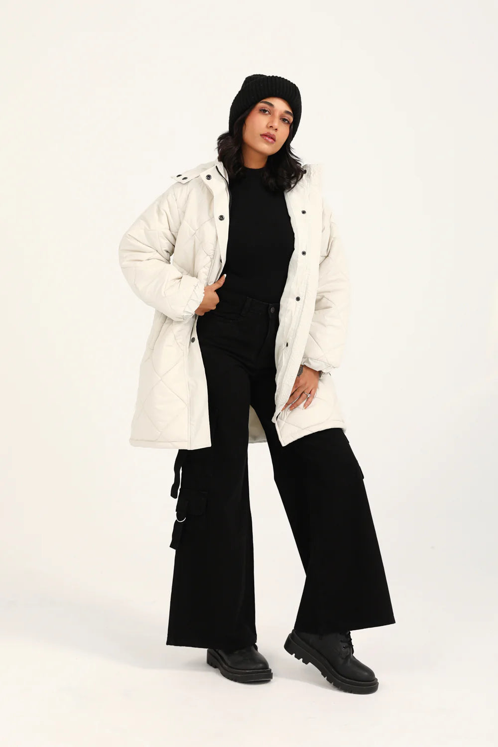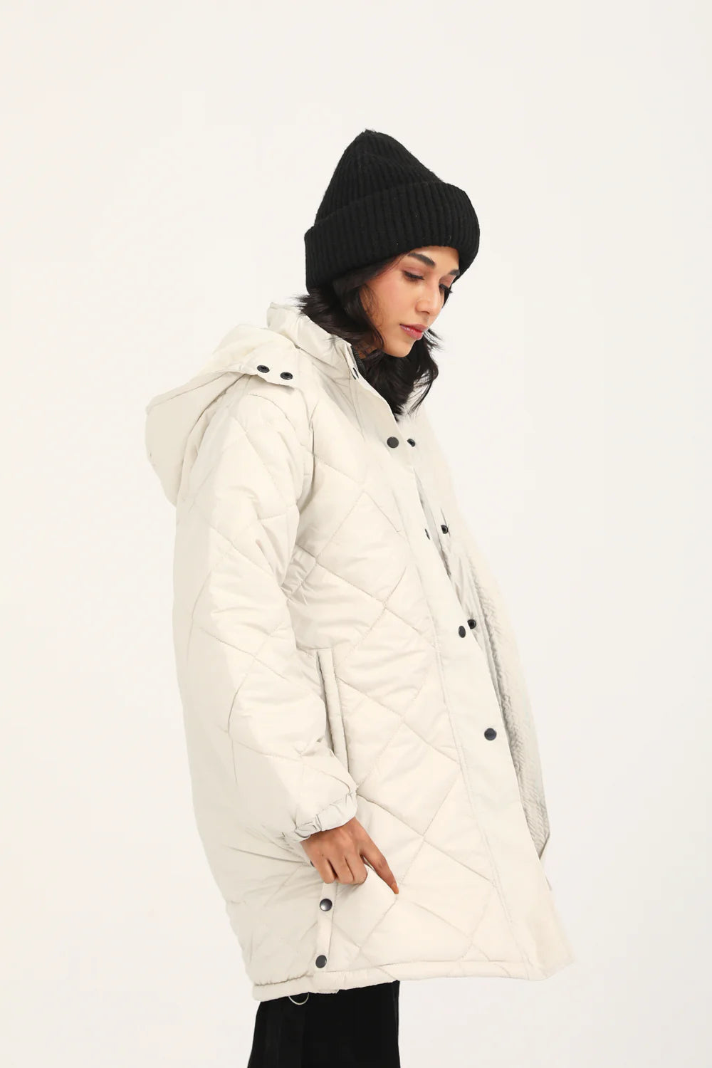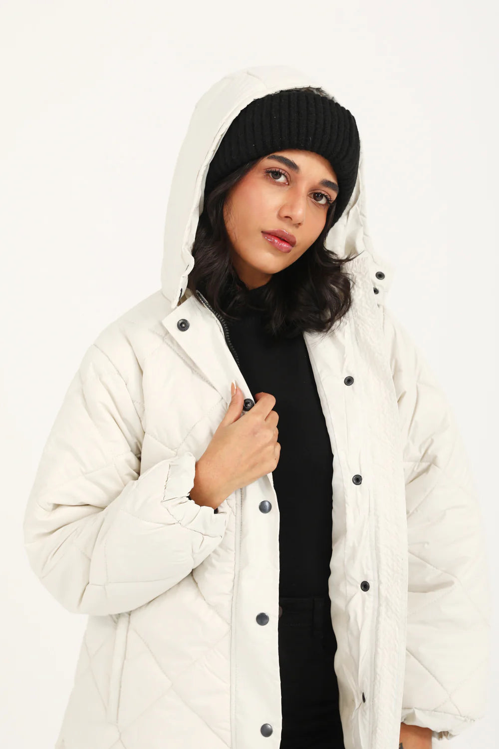 Long off-white puffer jacket featuring a quilted design, metallic snap buttons and zipper closure, finished with a hood.