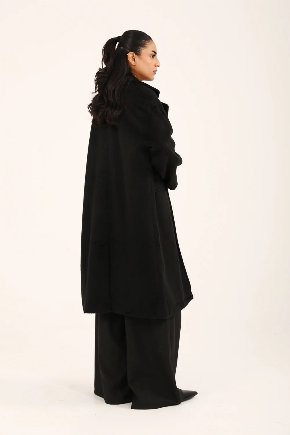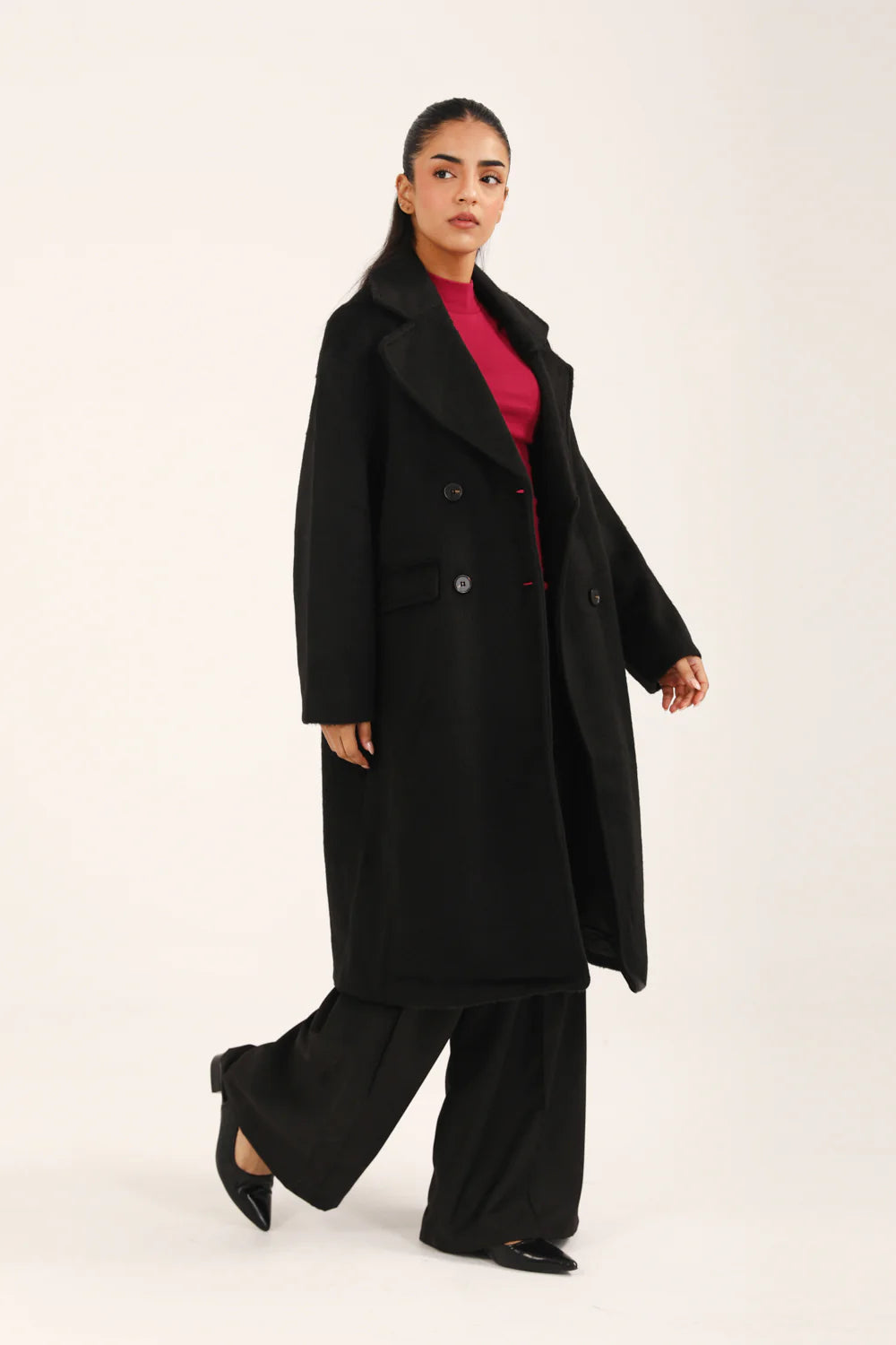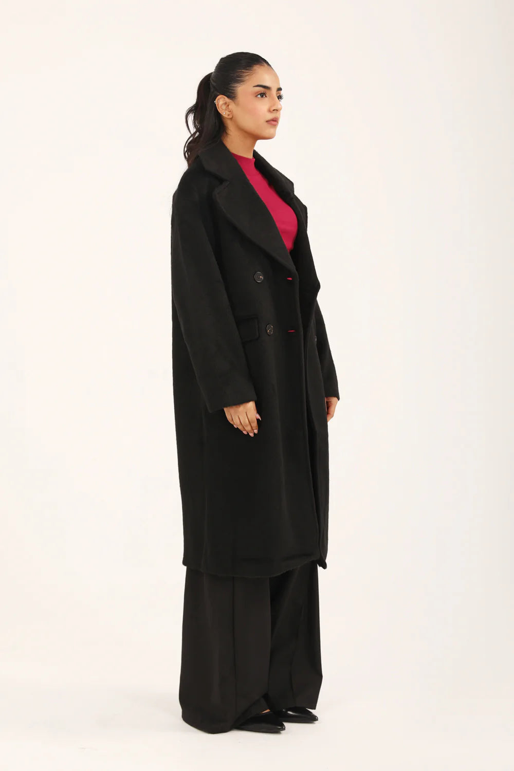 Black textured oversized coat featuring a double breasted front with matching buttons.