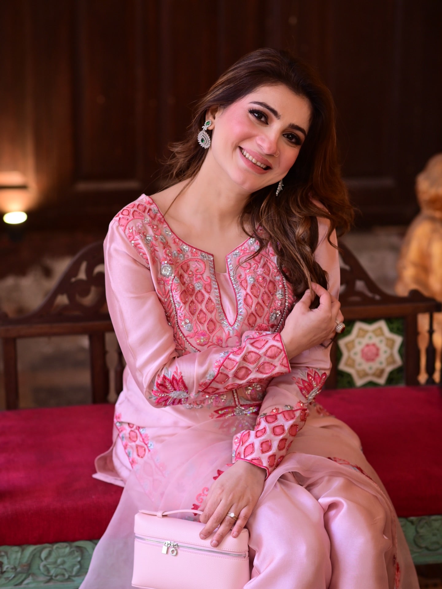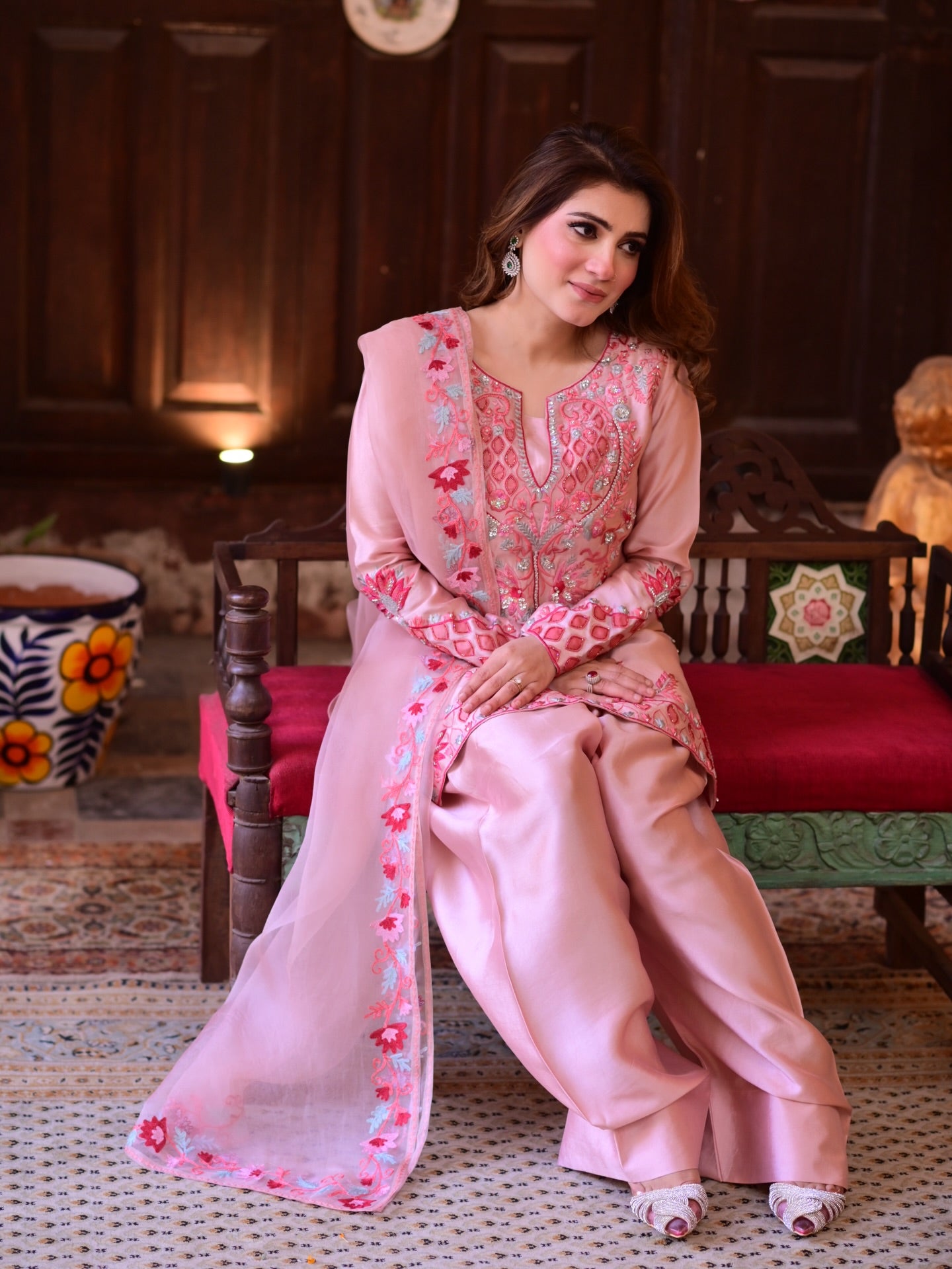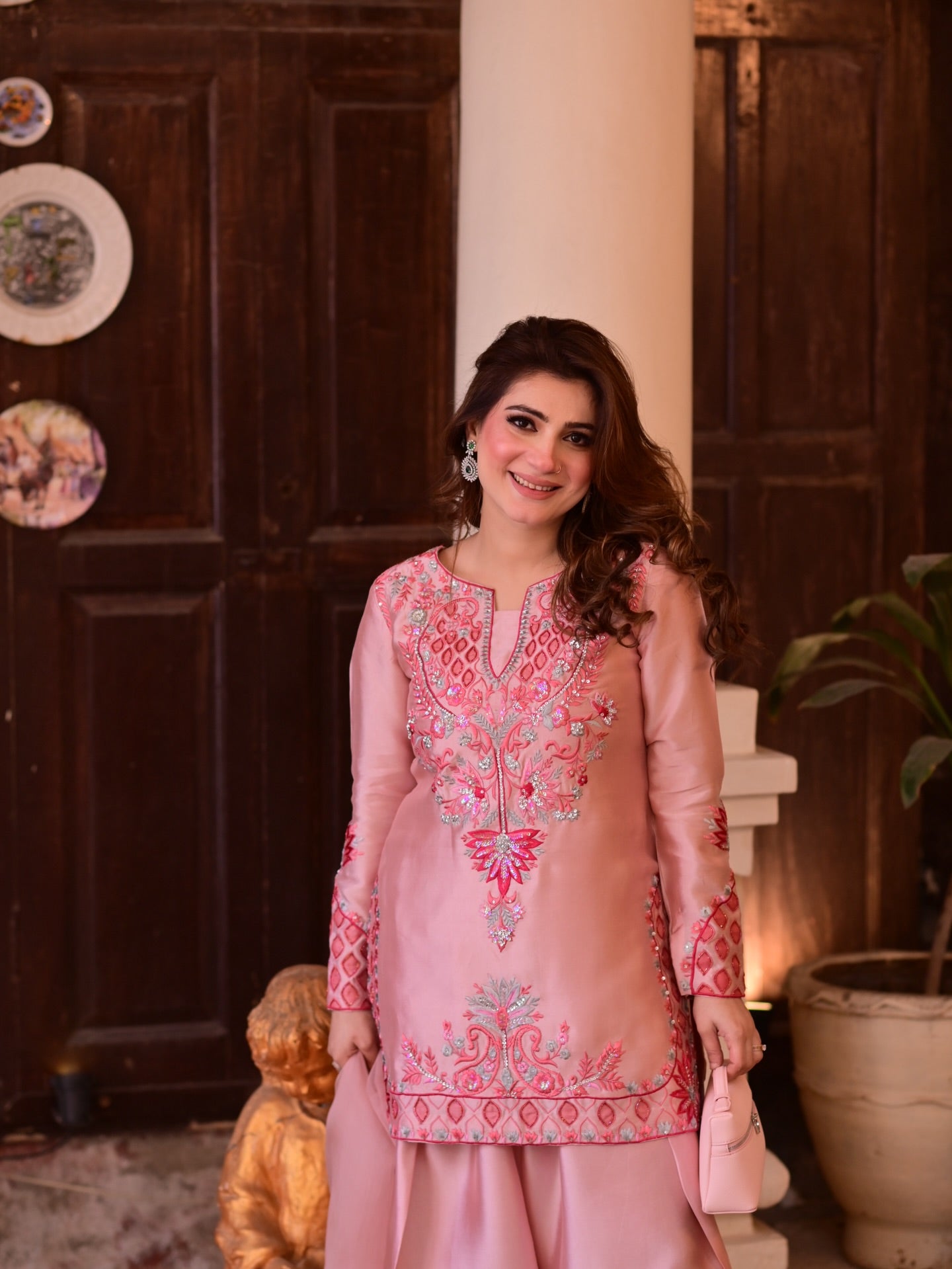 A modern blush ensemble featuring a structured embroidered short kurta paired with fluid wide-leg palazzos.