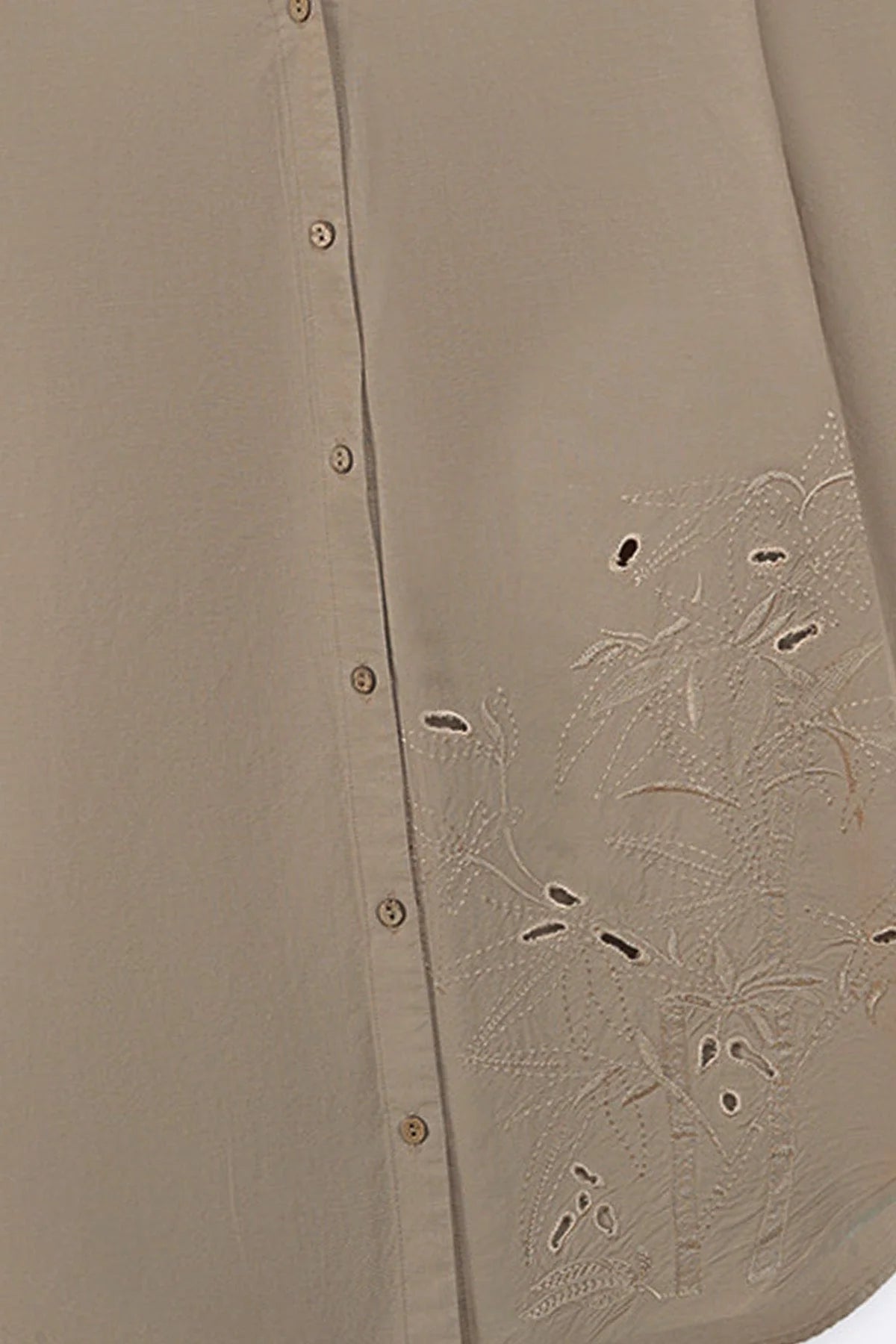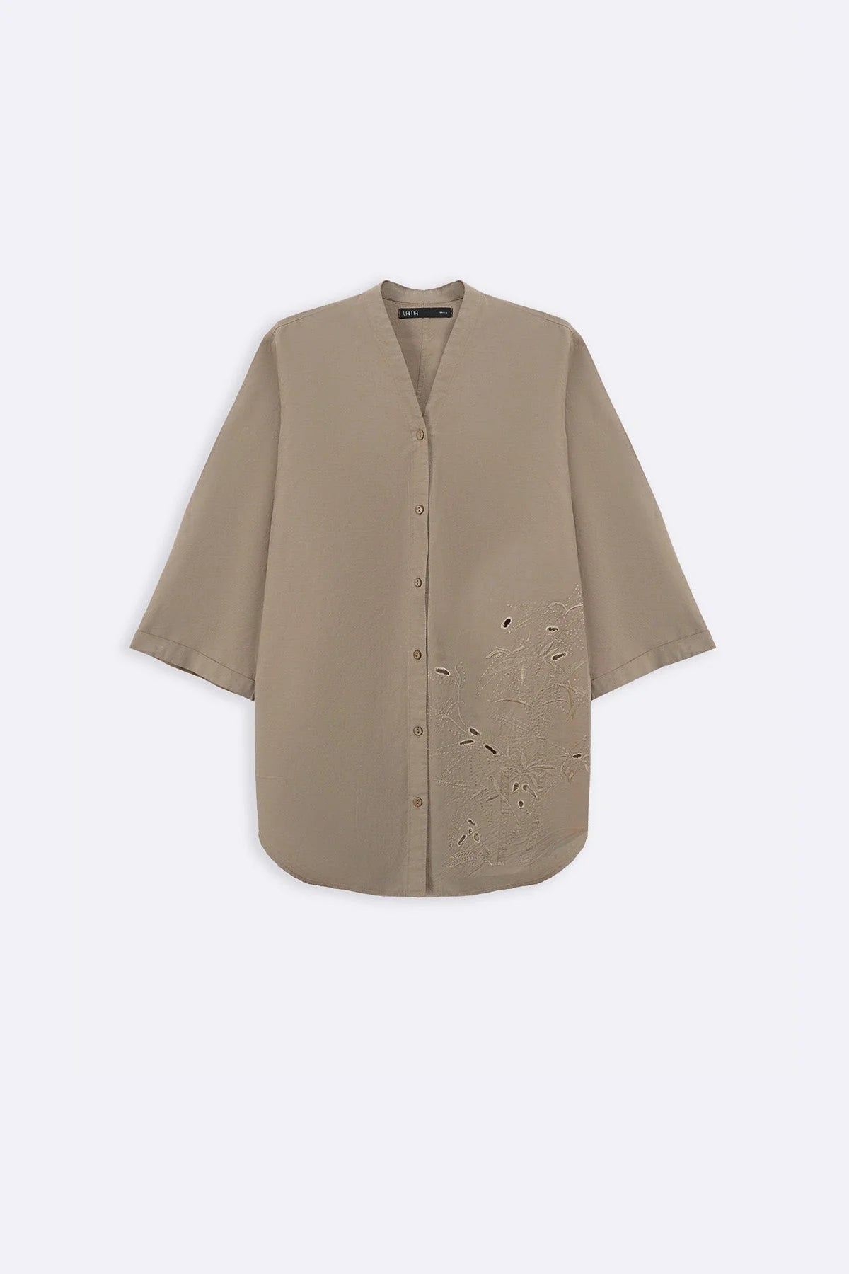 Design details: Embroidered V-neck shirt with a front button-down closure, three-quarter turn-up sleeves, and a rounded hem