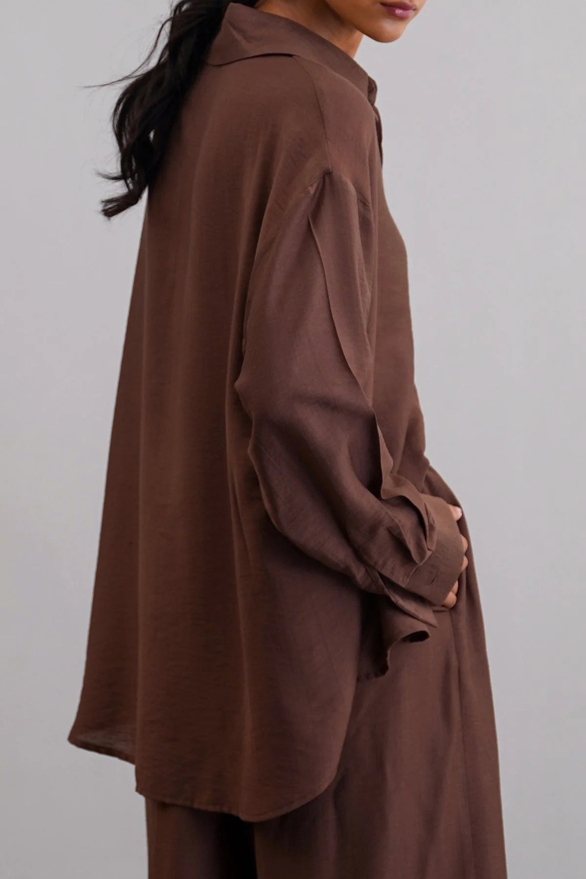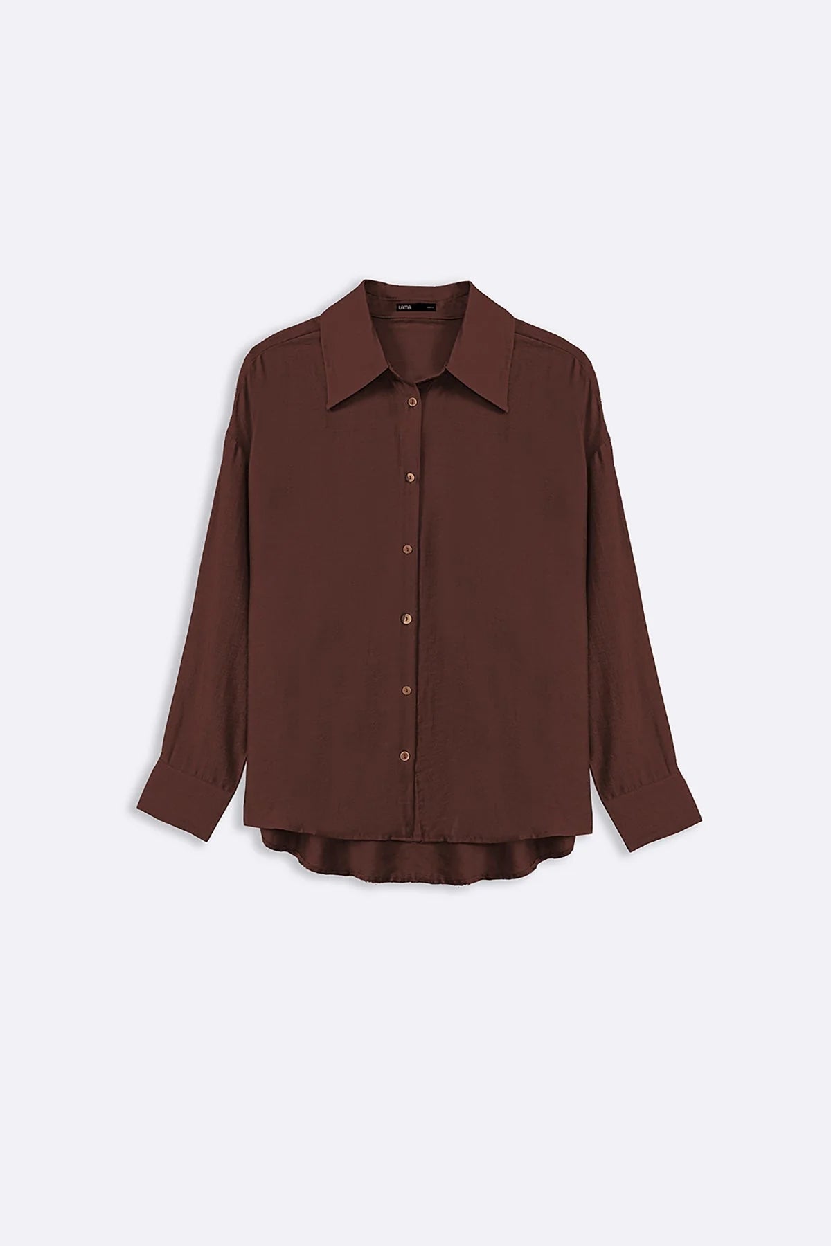 Design details: Collared button up shirt with cuffed sleeves, and a rounded hem.