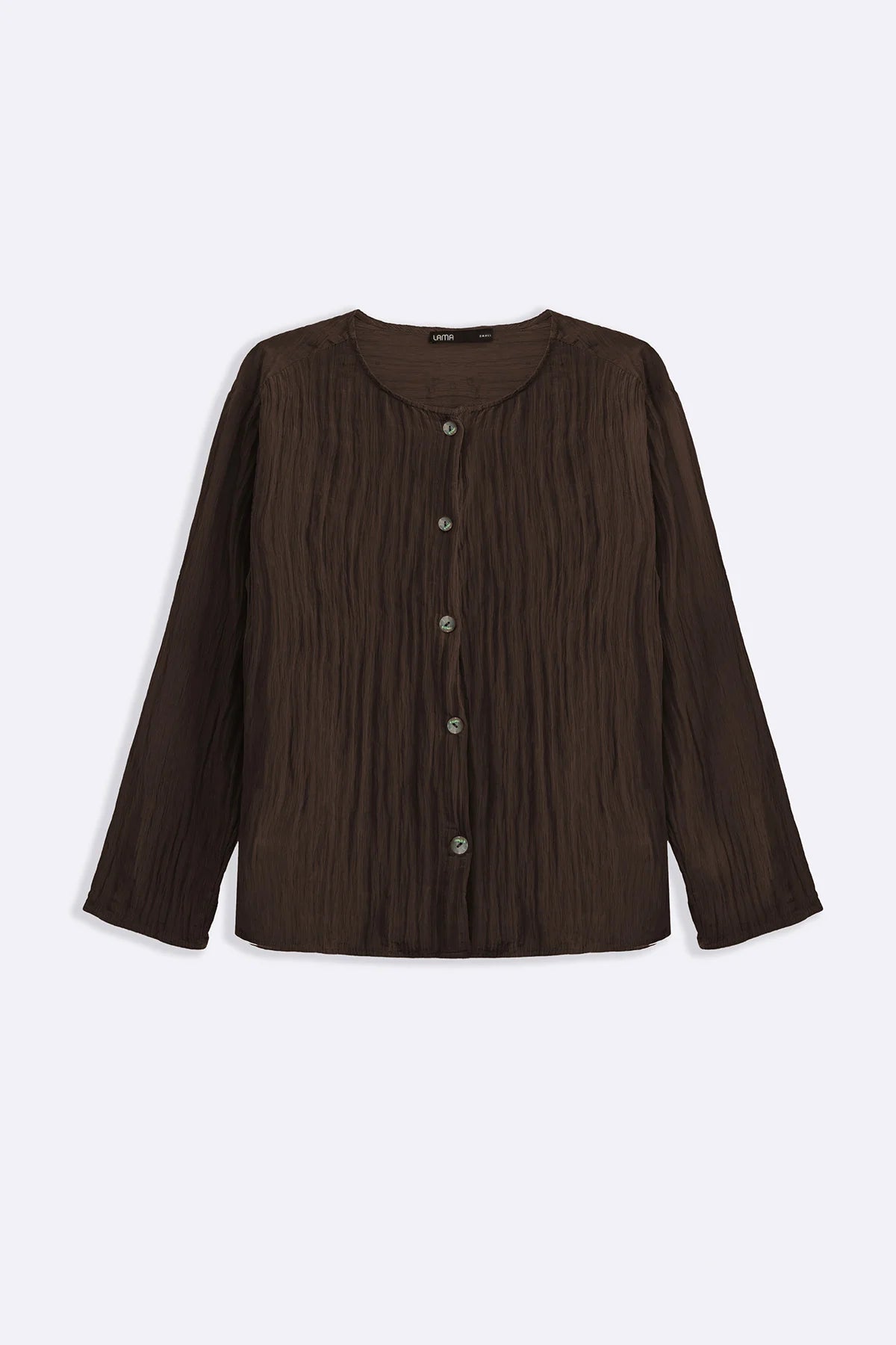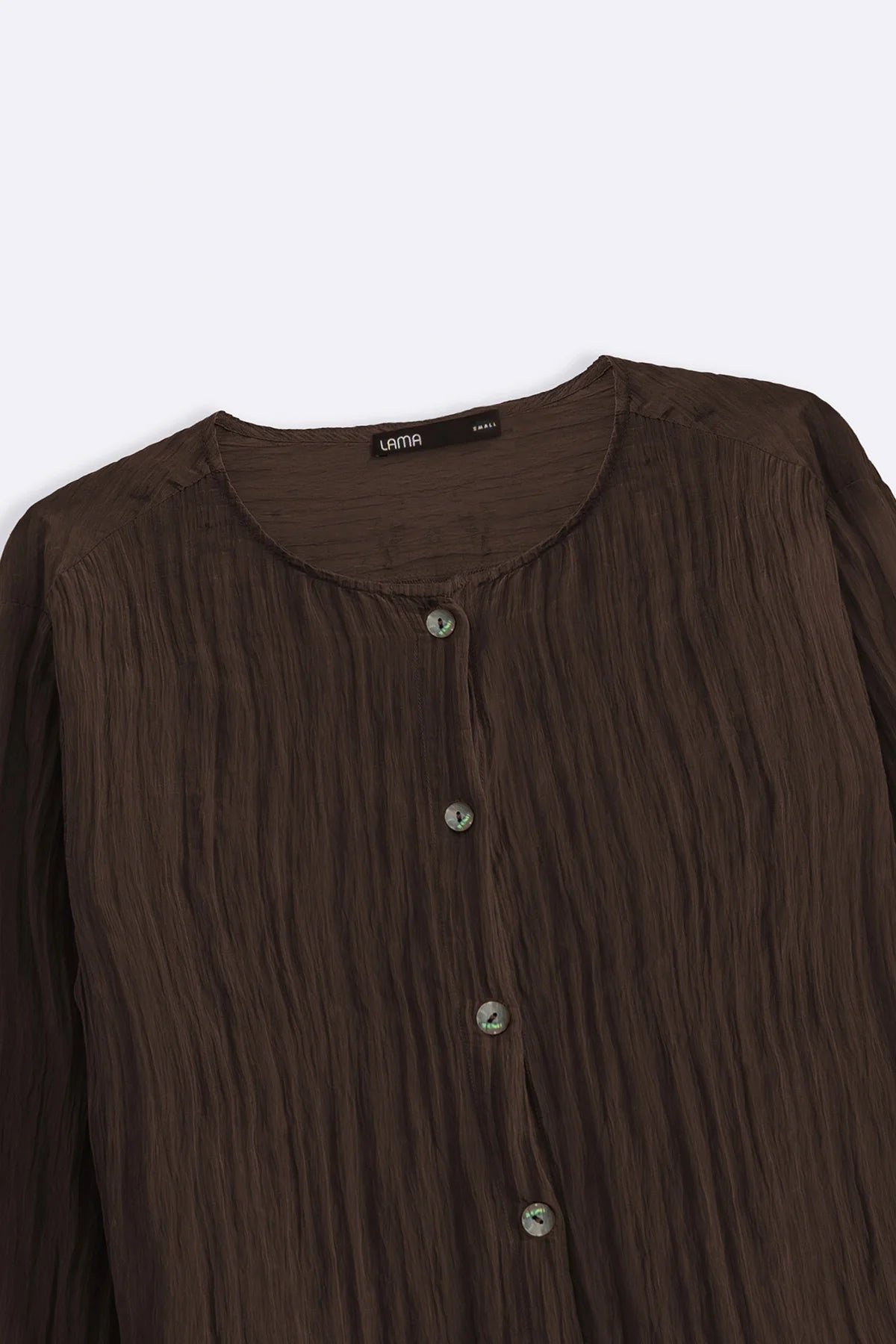 Design details: Crinkled top with a round neckline, full sleeves and front pearl button closure.
