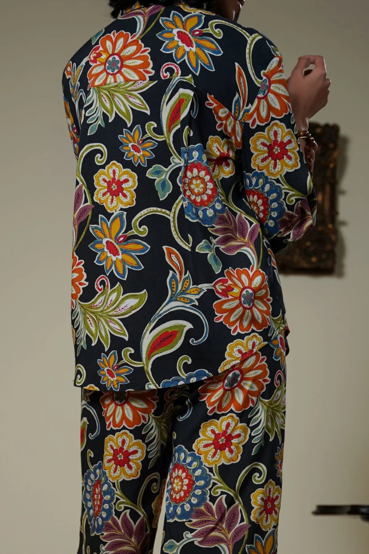 Design details: V-neck collared shirt with three quarter cuffed sleeves, rounded hem and tassel drawcords.