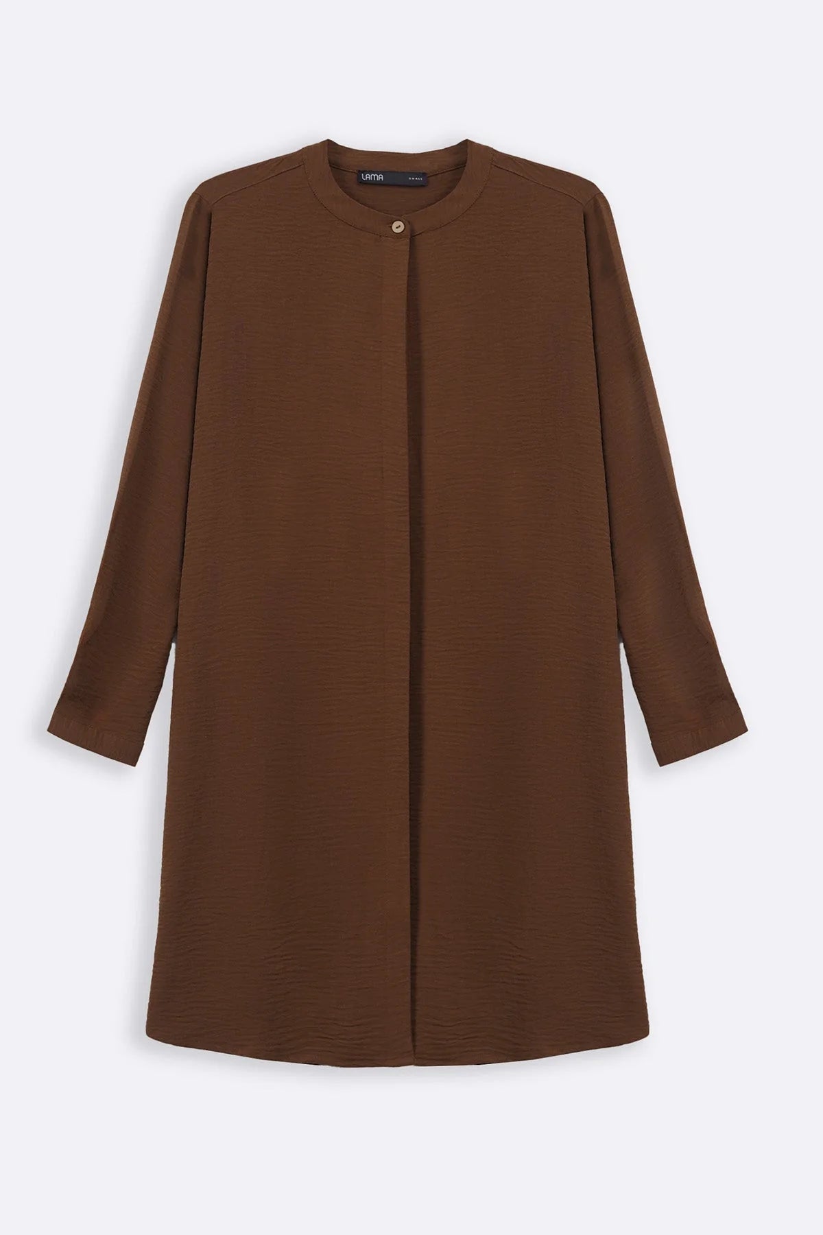 Design details: Tunic with band collar, cuffed long sleeves, and a hidden placket button closure.